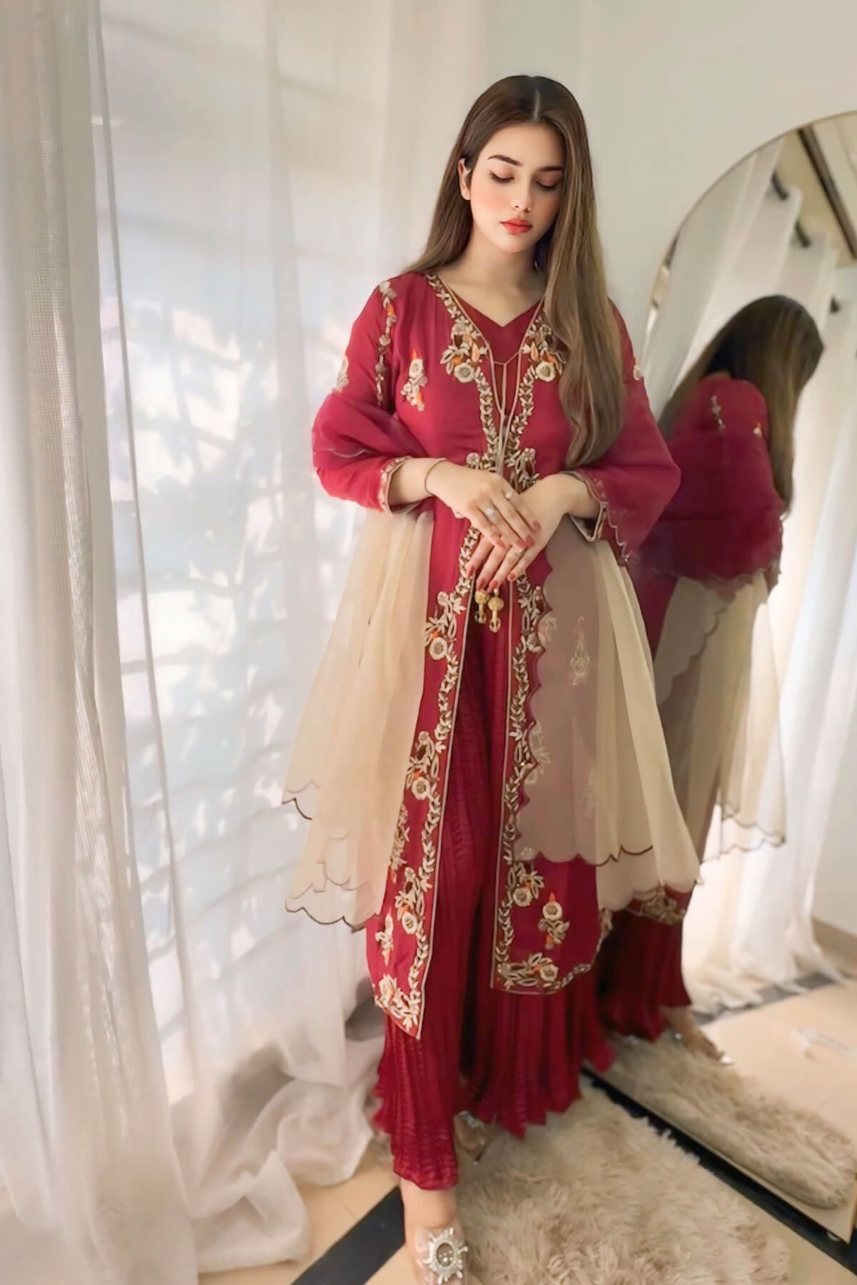 A refined expression of elegance by Emraan Kaxhif, crafted in rich maroon tussel silk with exquisite hand embroidery. Paired with a double-shaded organza dupatta and raw silk trousers, this ensemble exudes timeless sophistication—perfect for weddings, formal occasions, and festive celebrations.
