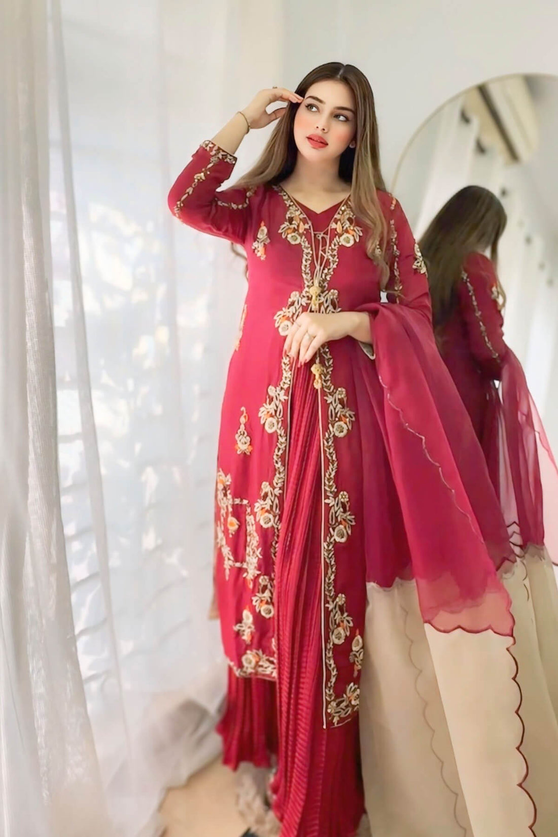 A regal ensemble that celebrates heritage artistry with modern finesse. This stunning organza outfit, adorned...