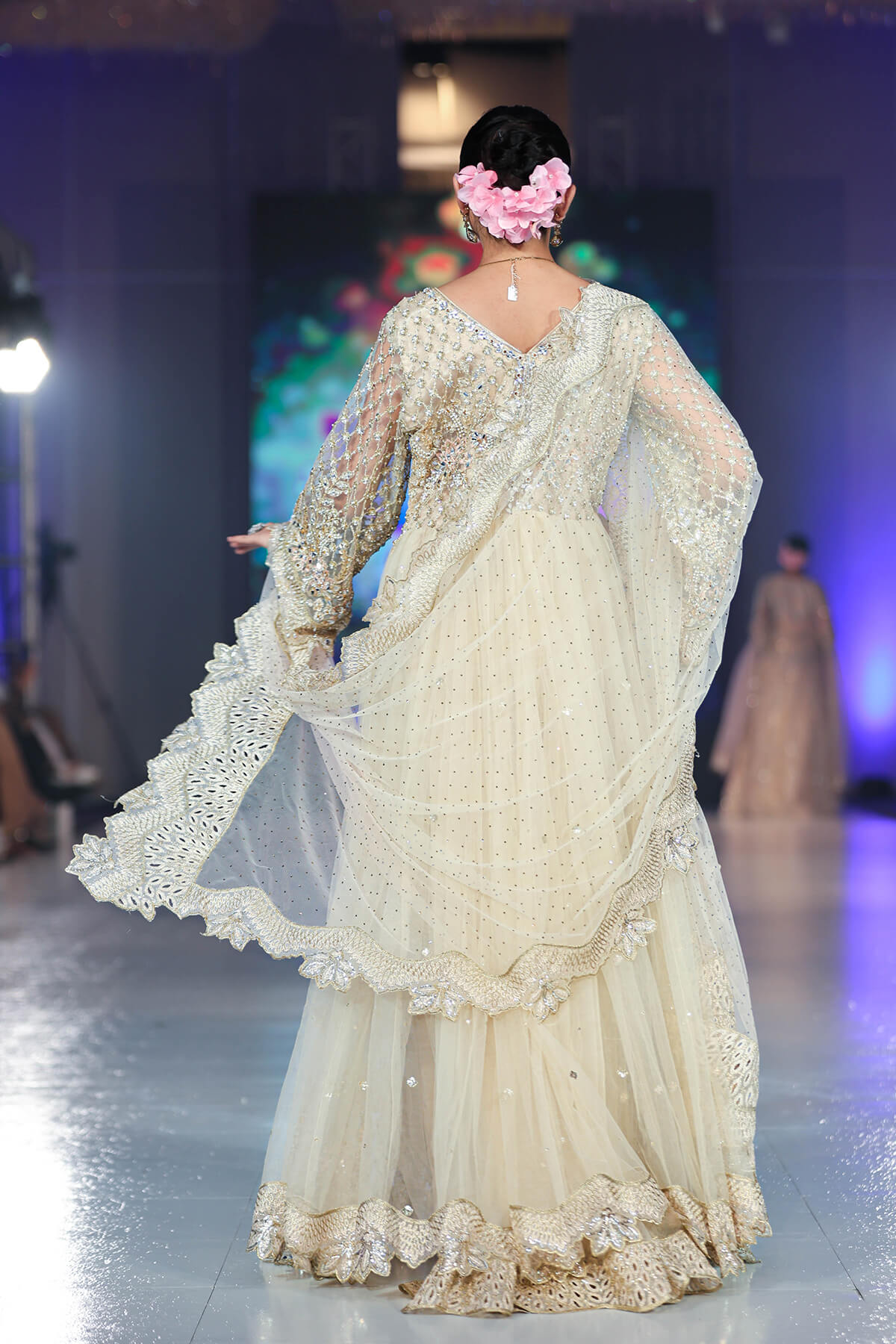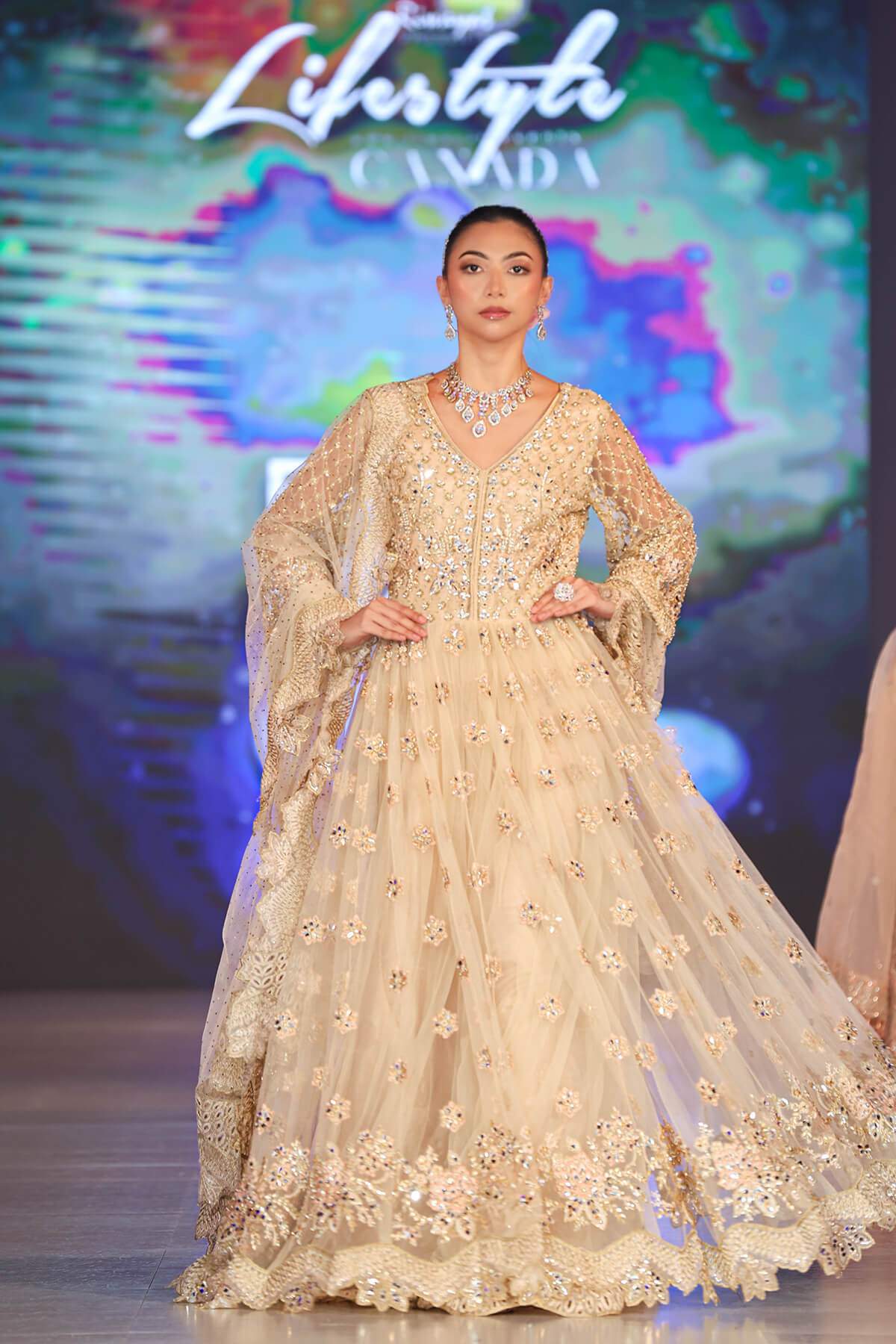 Step into timeless luxury with this breathtaking masterpiece — crafted in ethereal shades of champagne gold and adorned with intricate hand embellishments. The regal silhouette, layered with shimmering embroidery and delicate details, makes it a perfect ensemble for weddings, receptions, or any grand celebration. Each element reflects sophistication, grace, and artistry — designed for the woman who deserves nothing less than pure opulence.