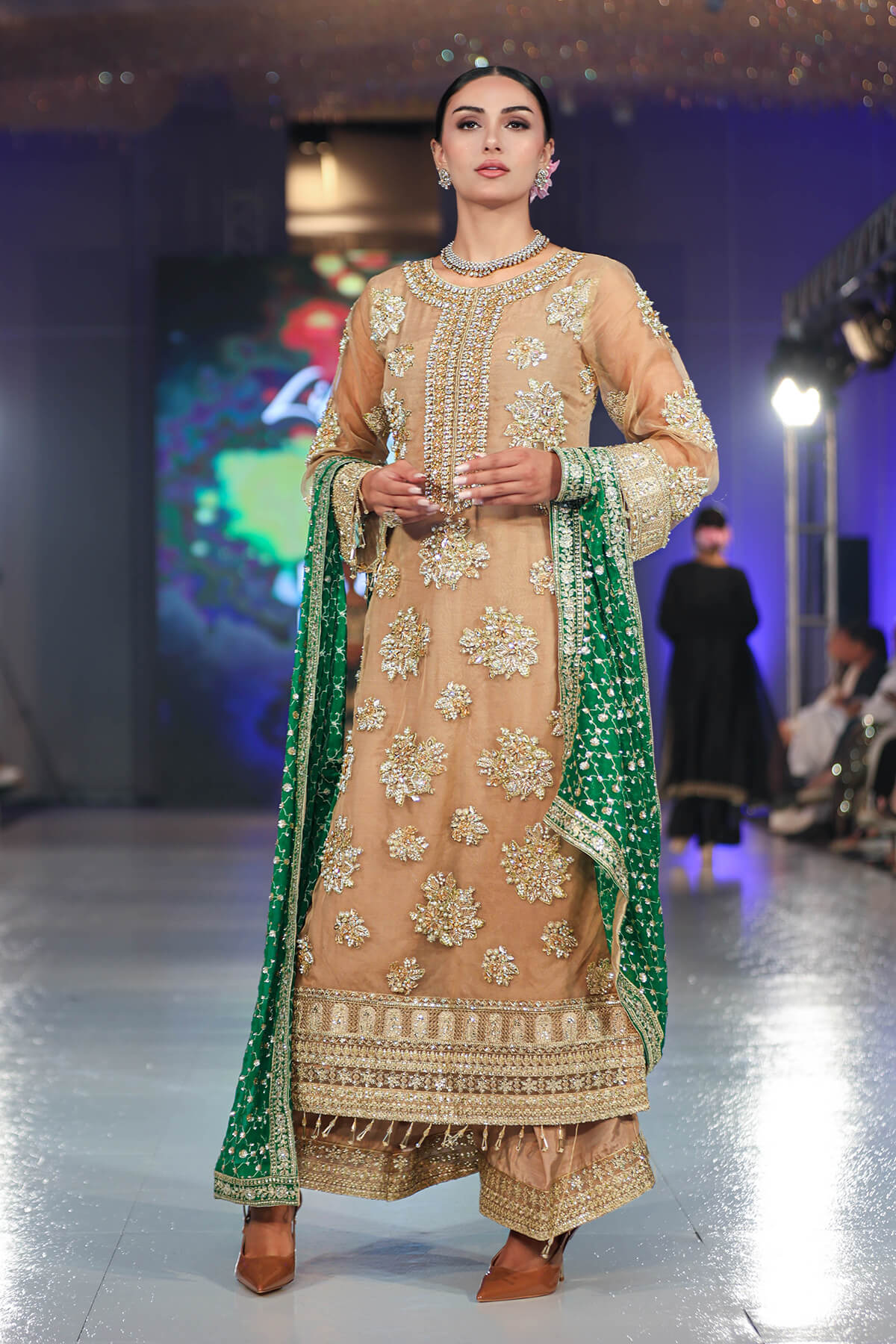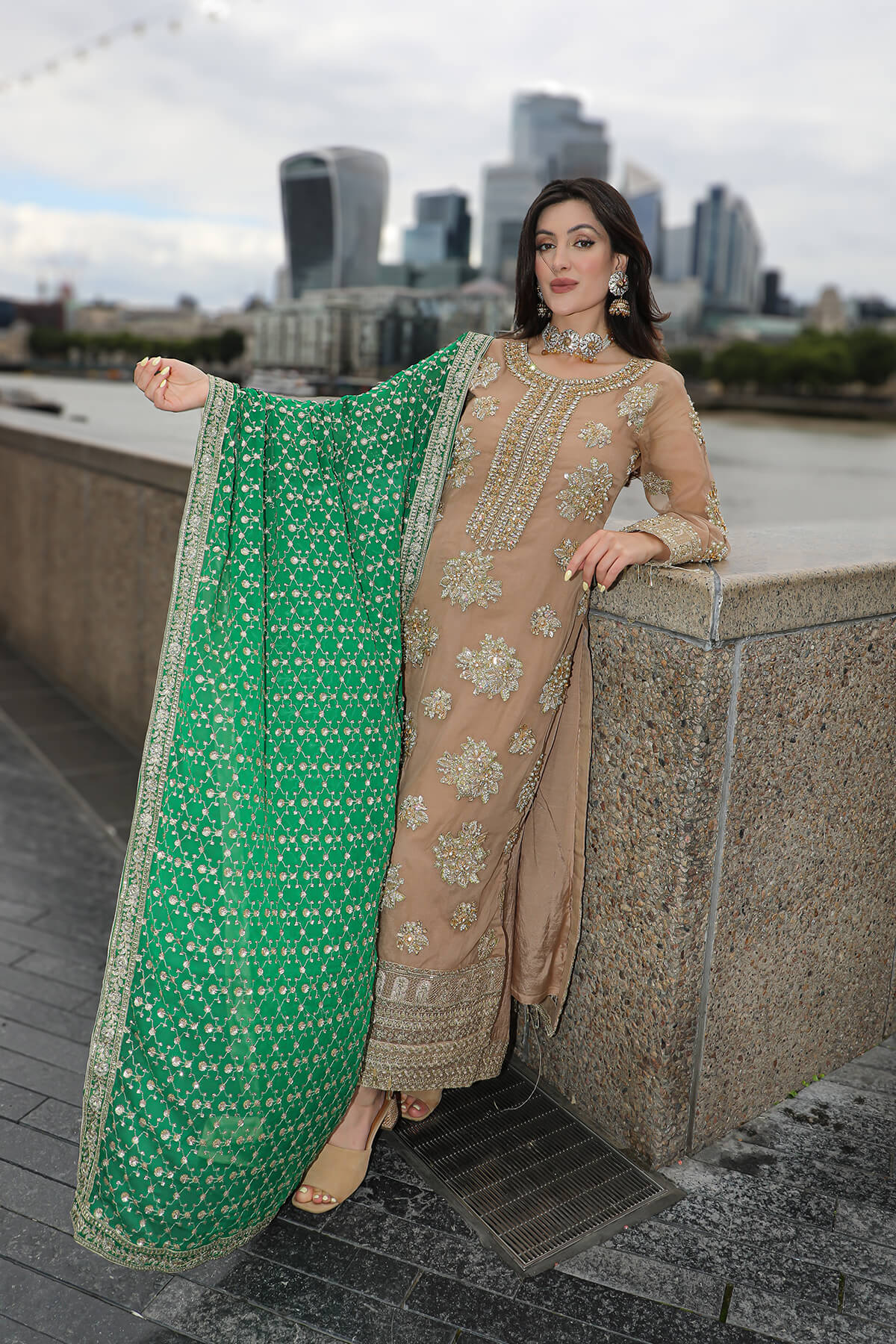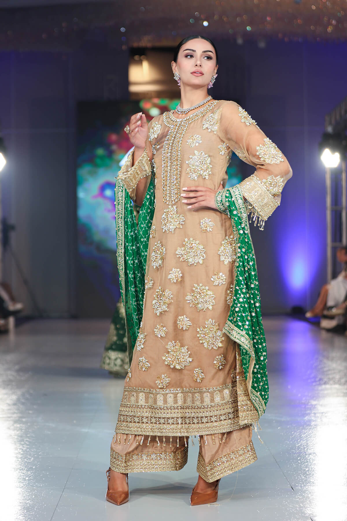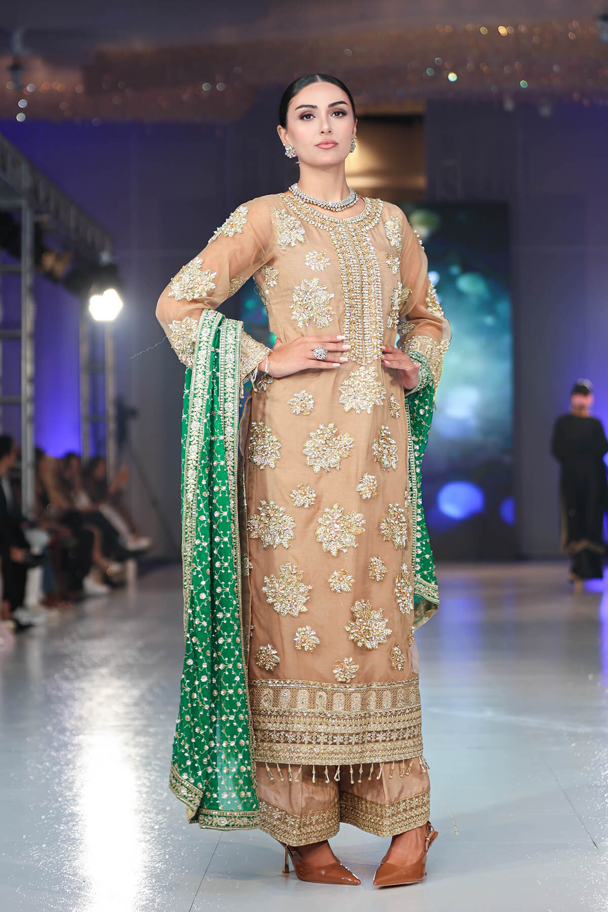 A regal ensemble that celebrates heritage artistry with modern finesse. This stunning organza outfit, adorned with intricate hand embellishments, is a perfect blend of grace and grandeur. The luminous embroidery paired with a vibrant green sequined dupatta creates a striking contrast, making it a timeless choice for festive occasions and wedding celebrations. The exquisite finishing on borders adds a touch of luxury, ensuring every detail speaks of refinement and elegance.
