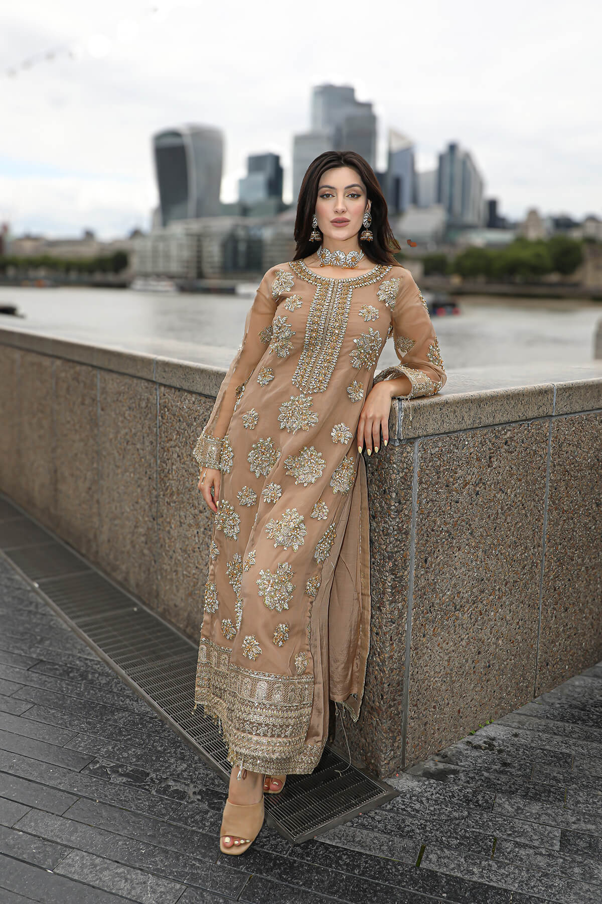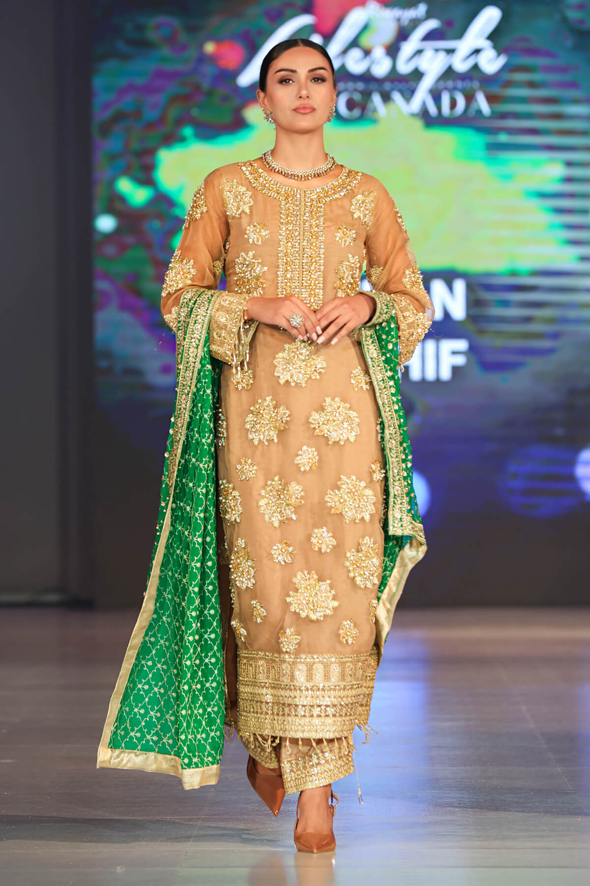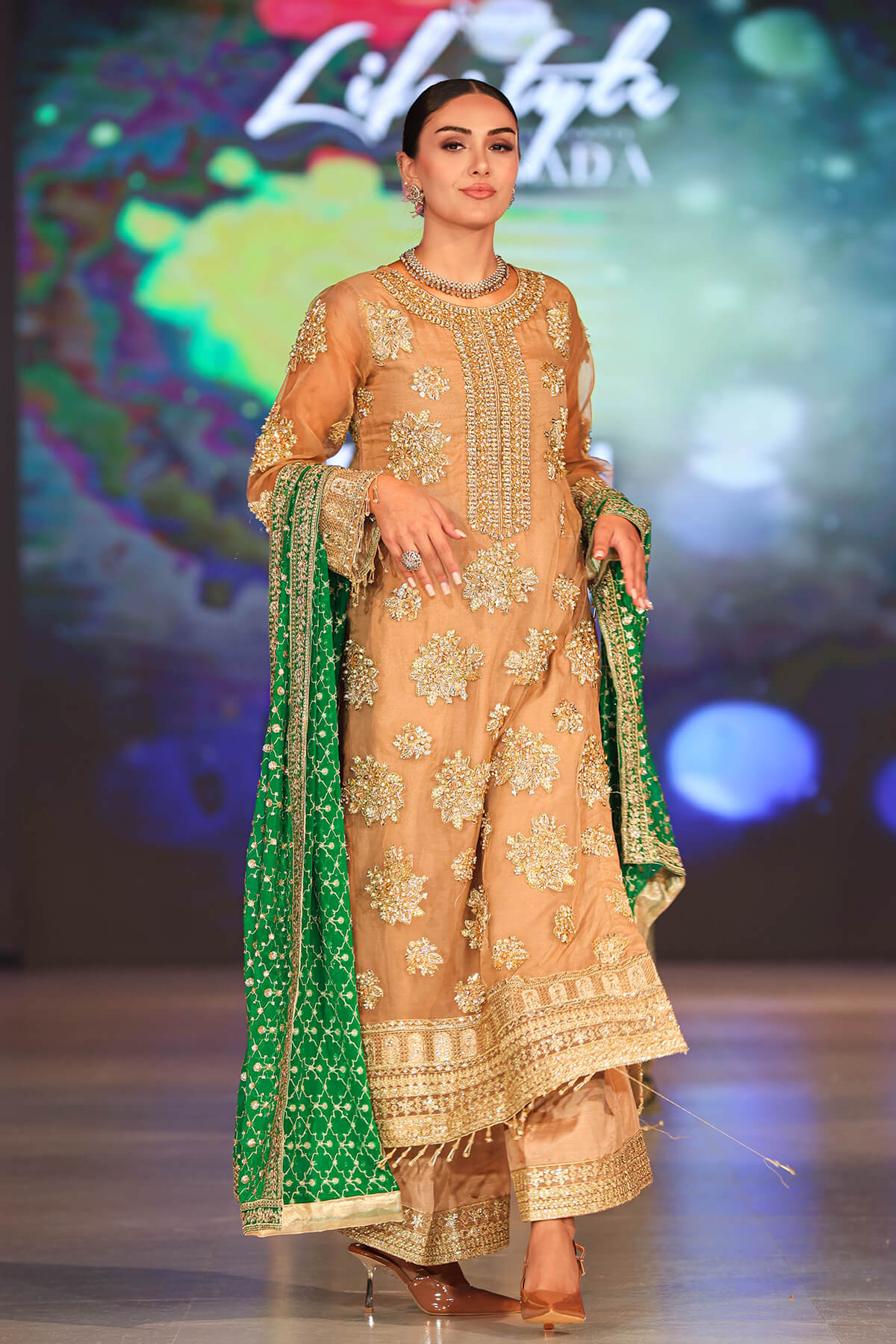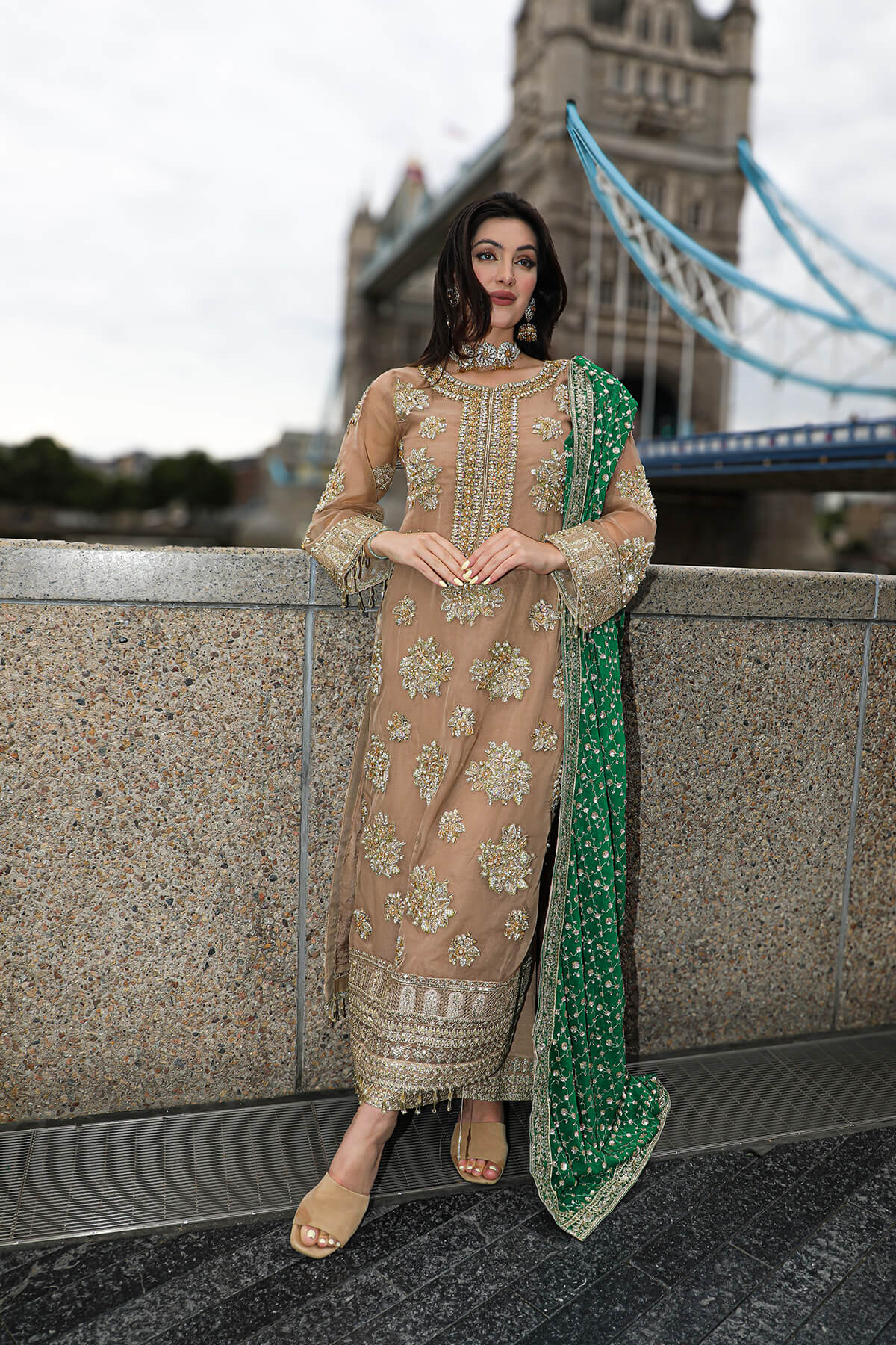 A regal ensemble that celebrates heritage artistry with modern finesse. This stunning organza outfit, adorned with intricate hand embellishments, is a perfect blend of grace and grandeur. The luminous embroidery paired with a vibrant green sequined dupatta creates a striking contrast, making it a timeless choice for festive occasions and wedding celebrations. The exquisite finishing on borders adds a touch of luxury, ensuring every detail speaks of refinement and elegance.