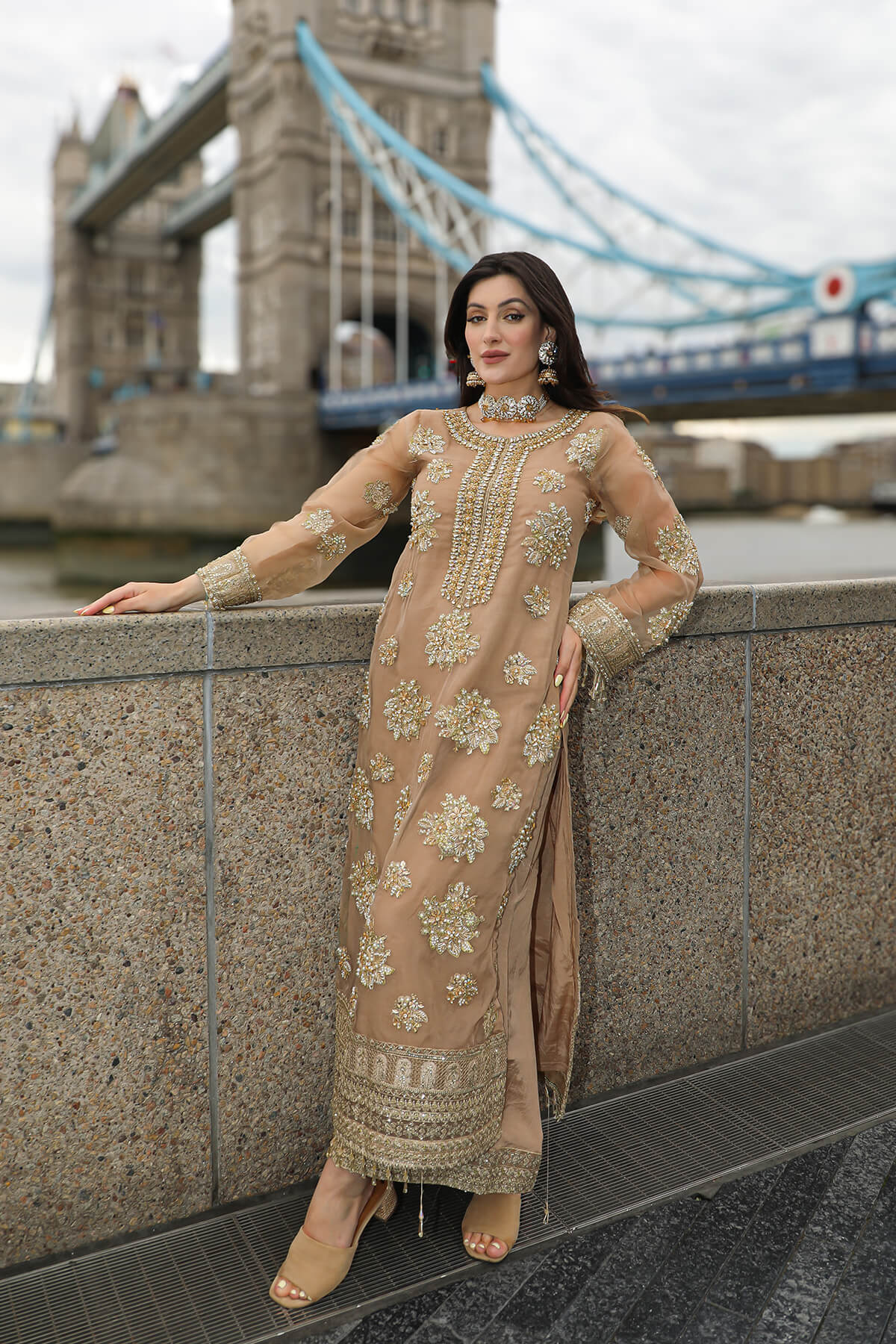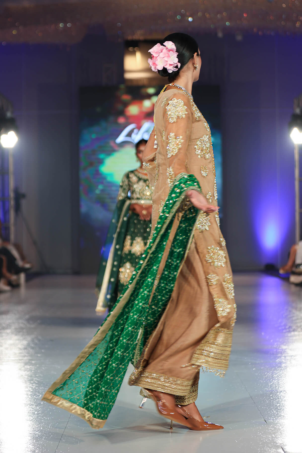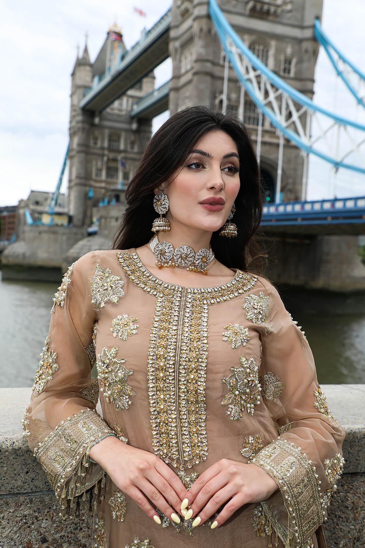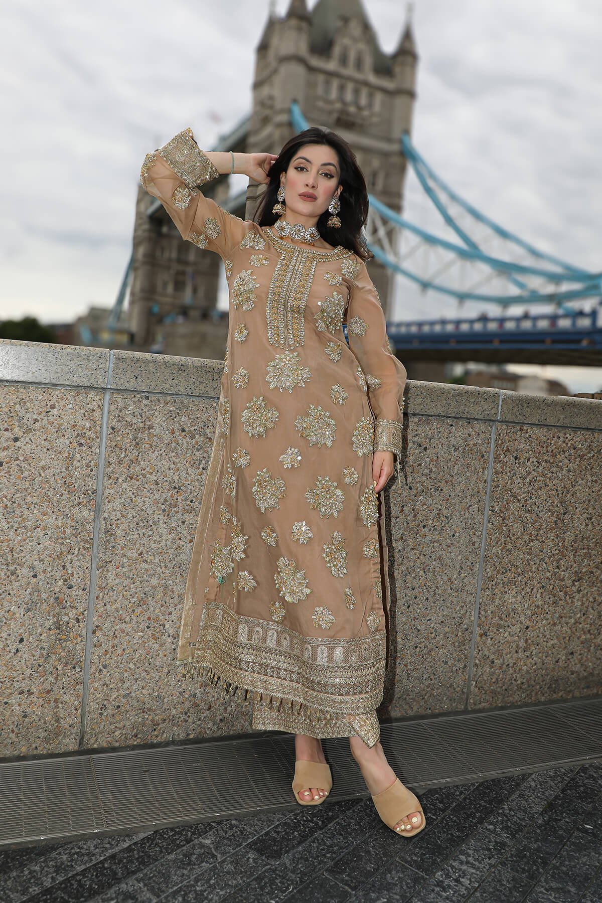 A regal ensemble that celebrates heritage artistry with modern finesse. This stunning organza outfit, adorned with intricate hand embellishments, is a perfect blend of grace and grandeur. The luminous embroidery paired with a vibrant green sequined dupatta creates a striking contrast, making it a timeless choice for festive occasions and wedding celebrations. The exquisite finishing on borders adds a touch of luxury, ensuring every detail speaks of refinement and elegance.
