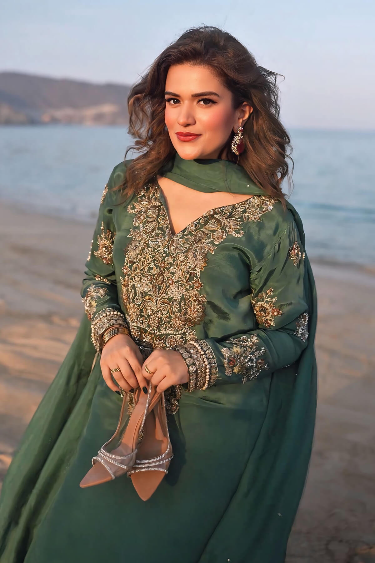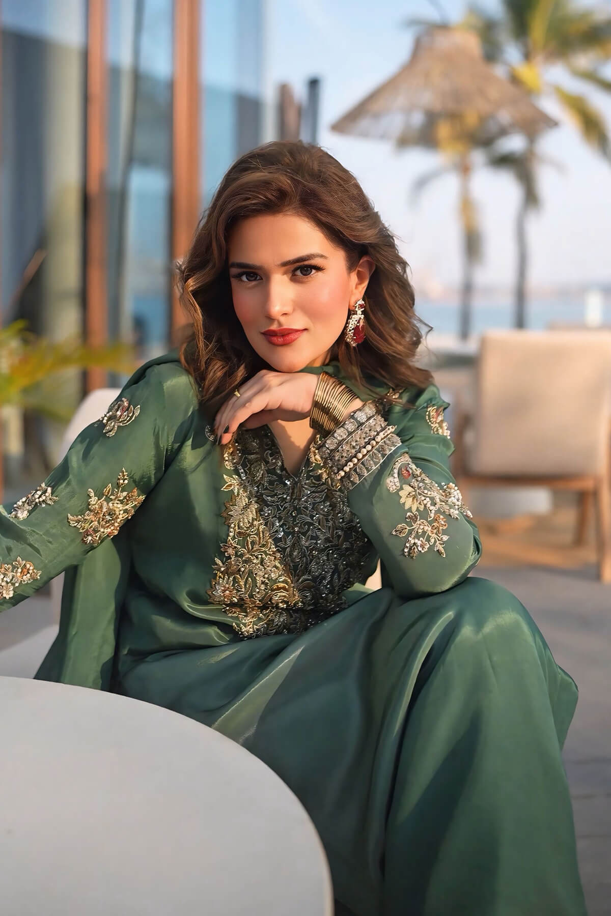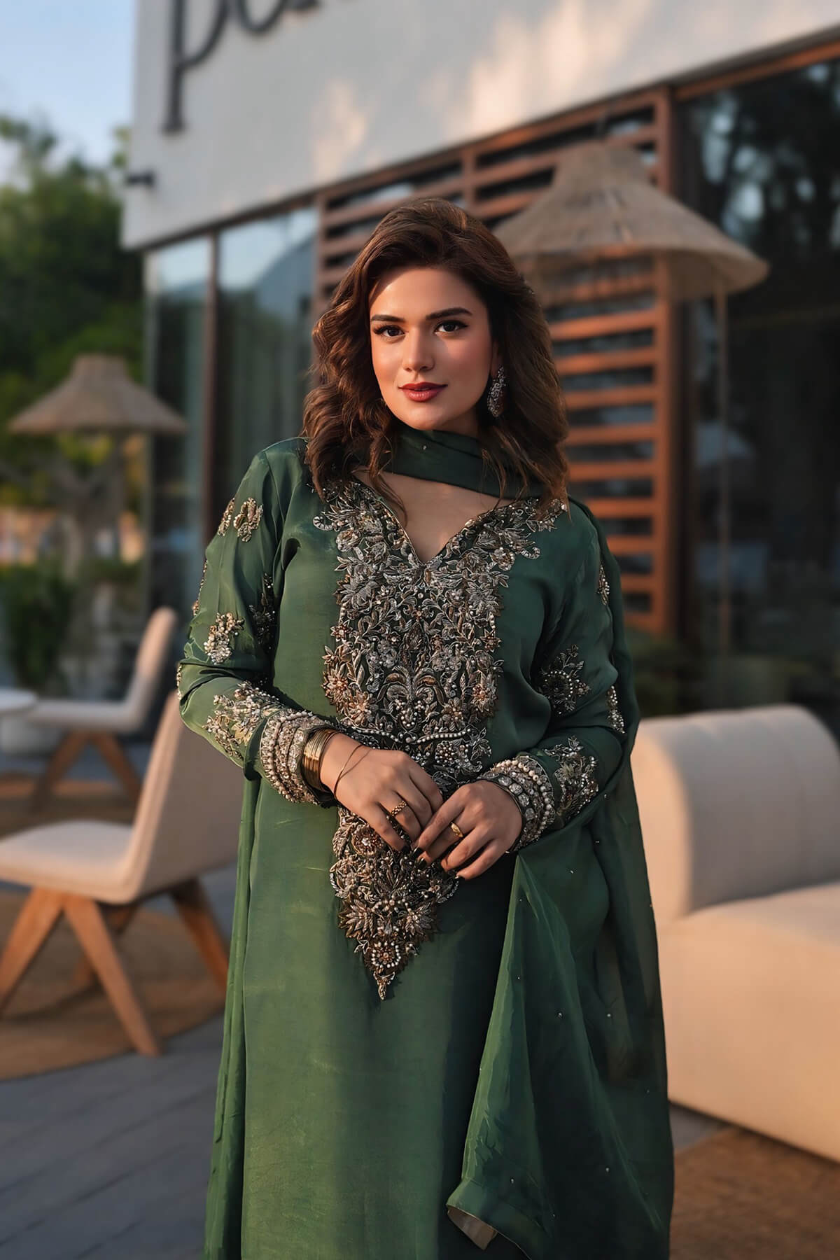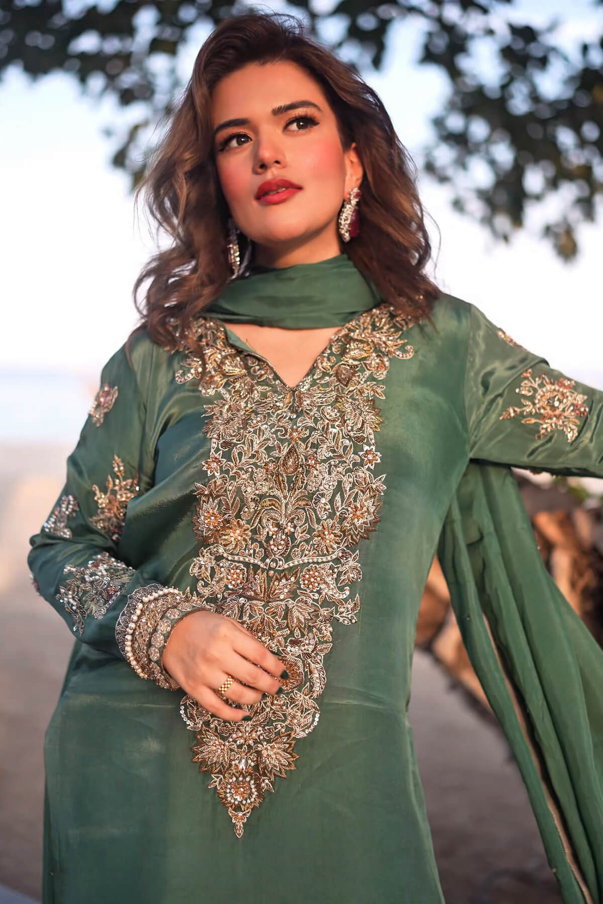 Jade Empress is a majestic expression of contemporary elegance, crafted in luxurious jade-green tussel silk. The shirt is adorned with intricate multi hand embellishments and rich zari work, creating a statement of refined craftsmanship. Paired with matching tussel silk trousers and a graceful silk dupatta delicately finished with a shimmering Swarovski spray, this ensemble radiates regal charm. A perfect choice for weddings, festive soirées, and elevated formal occasions where timeless beauty takes center stage.