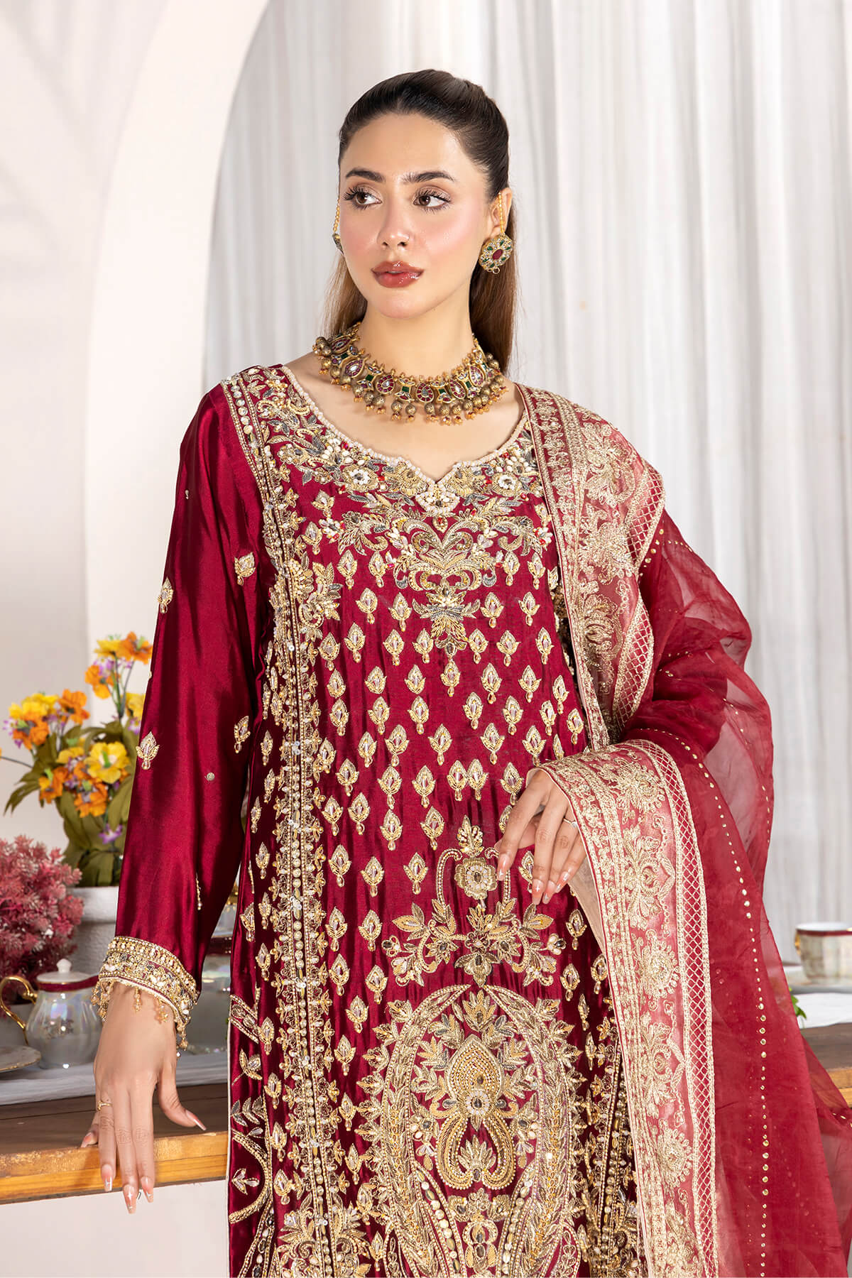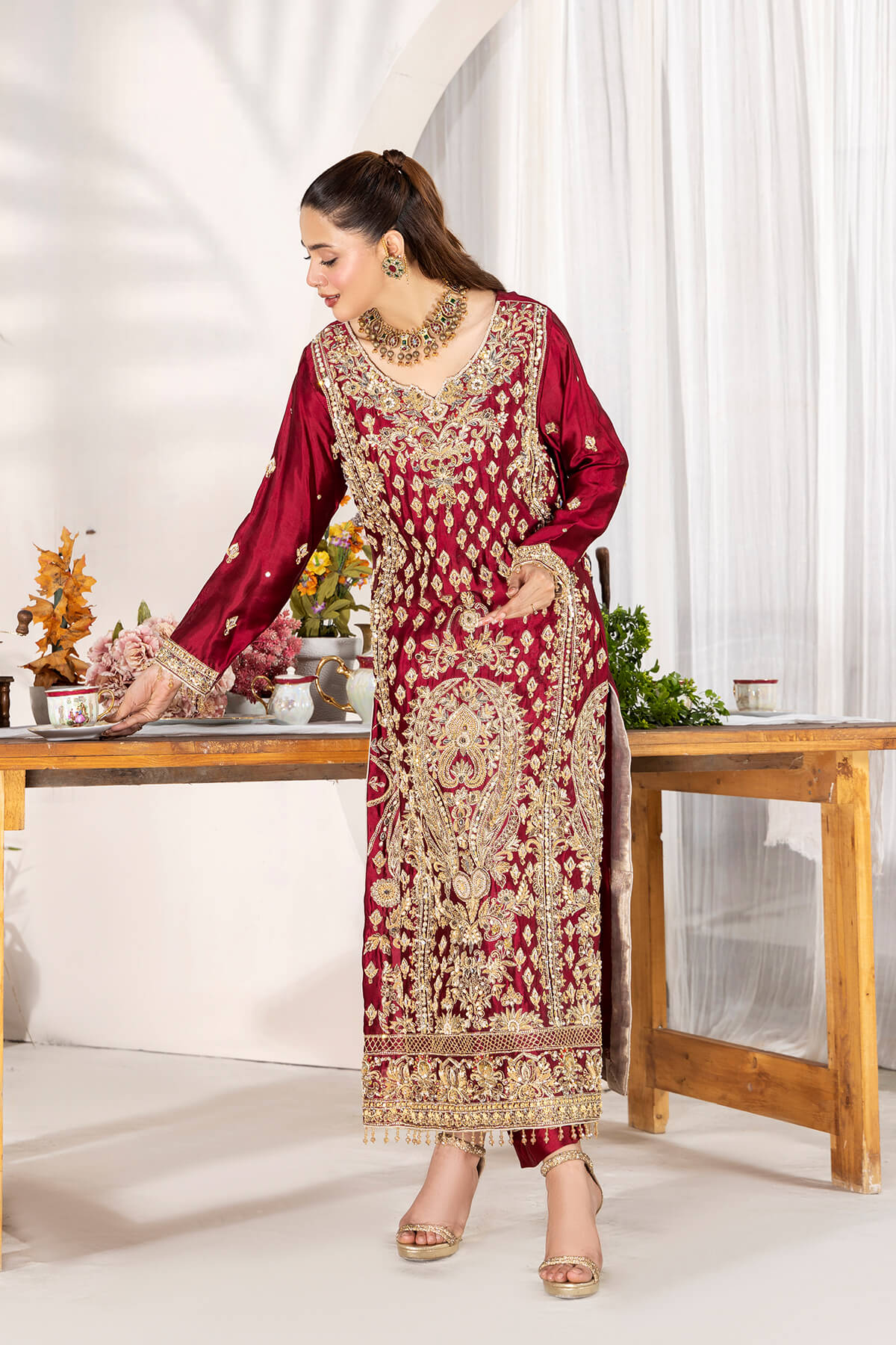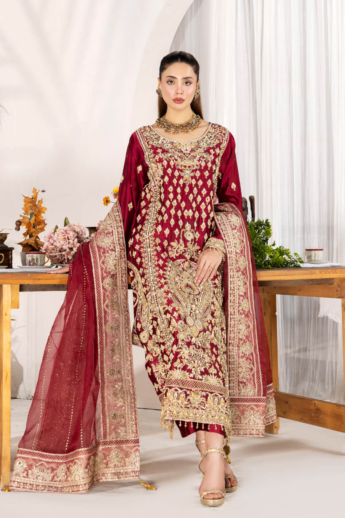 Command attention with this resplendent masterpiece — crafted in pure satin silk, richly hued in deep maroon and adorned with intricate golden embroidery. The ornate details flow seamlessly across the silhouette, exuding majesty and sophistication, while the ethereal organza dupatta adds a graceful, weightless finish. A true symbol of luxury, this ensemble is perfect for weddings, festive gatherings, and timeless celebrations.
