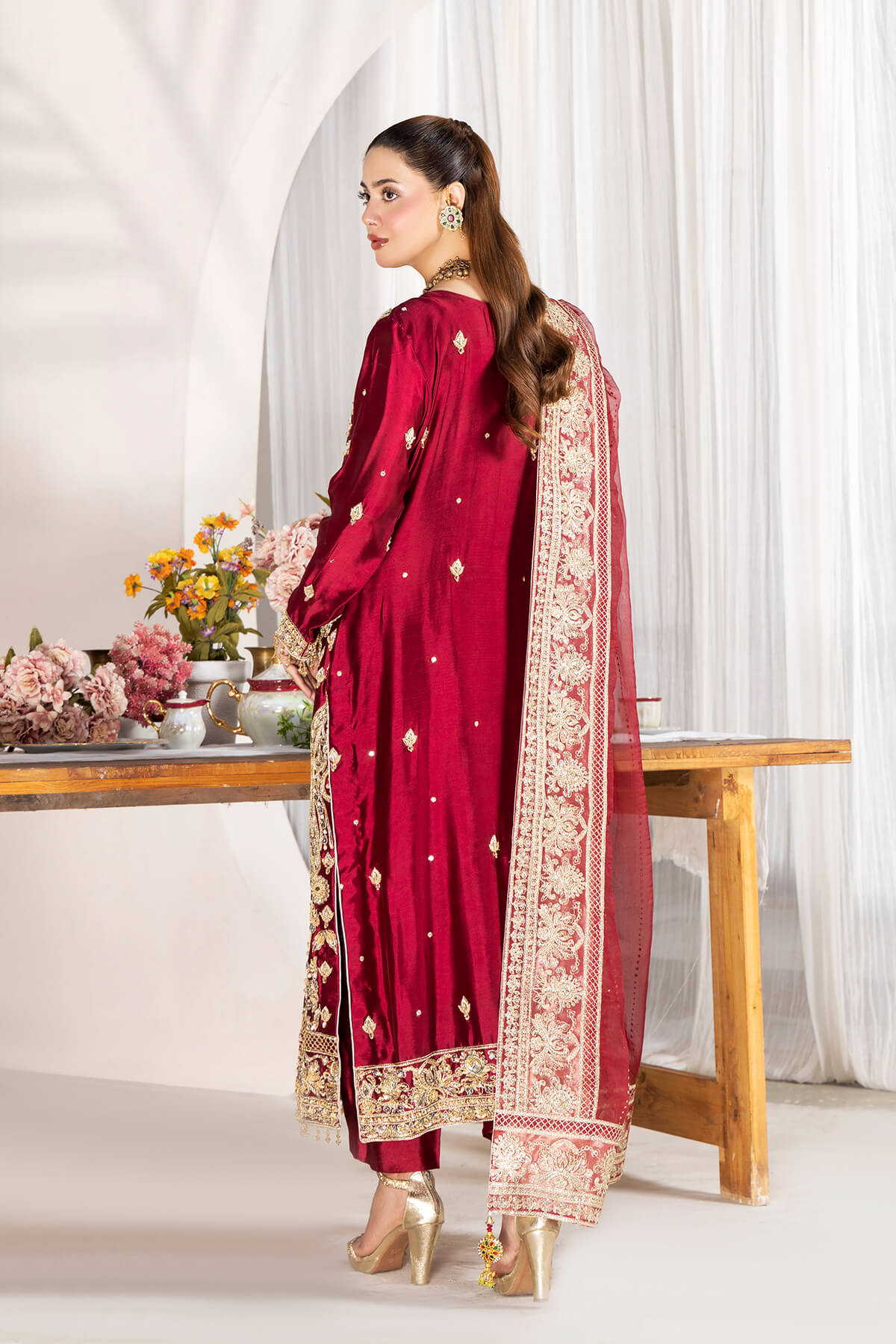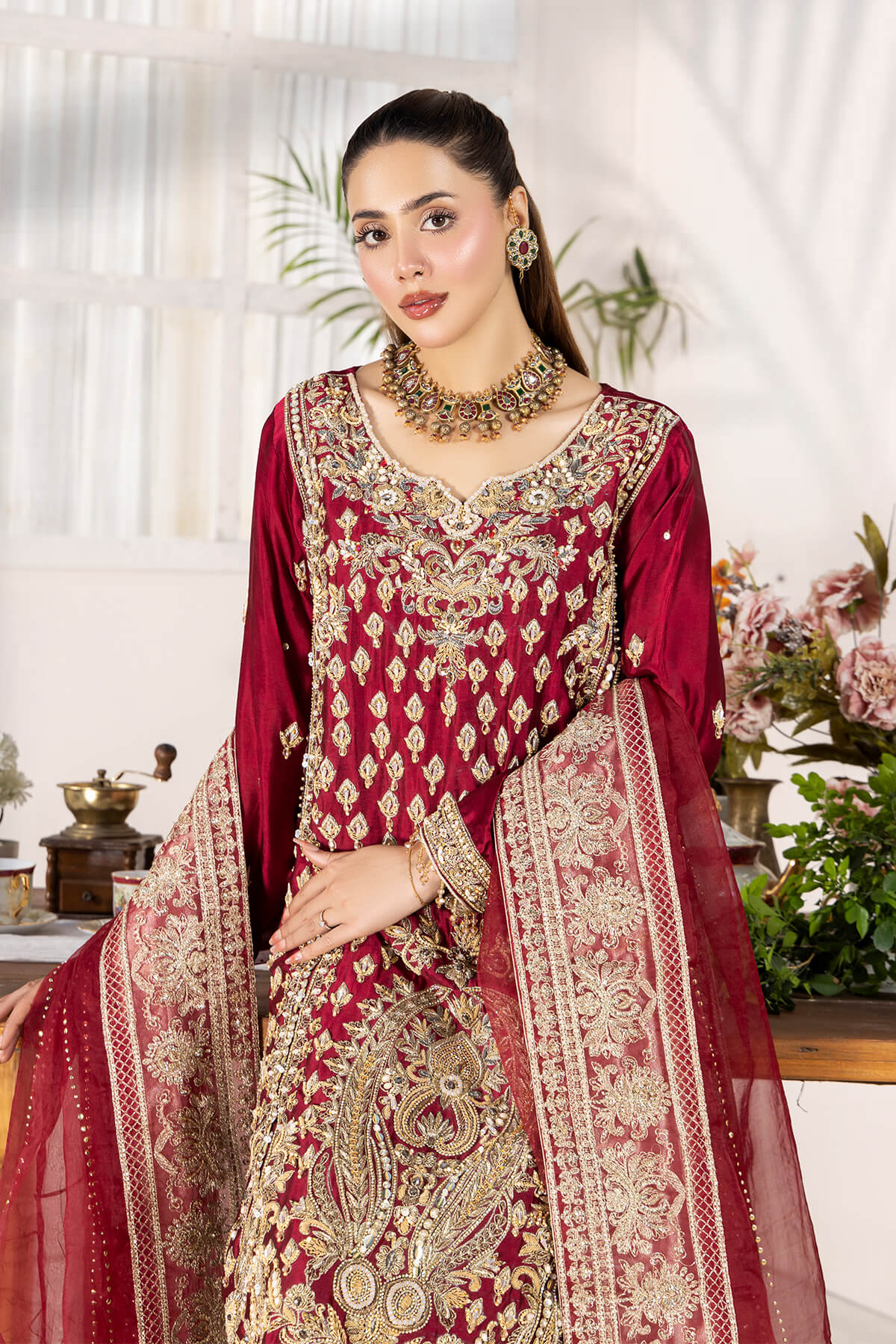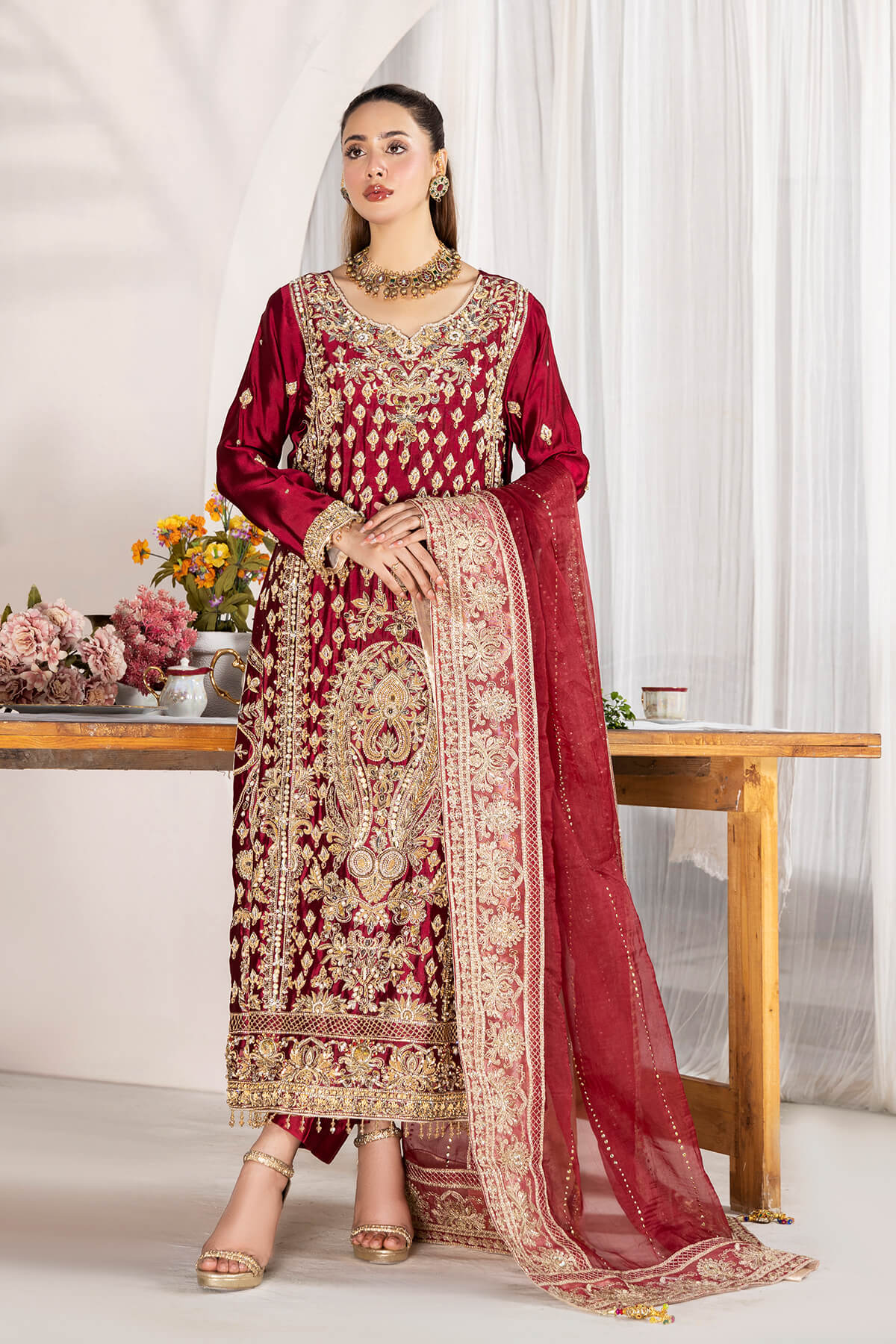 Command attention with this resplendent masterpiece — crafted in pure satin silk, richly hued in deep maroon and adorned with intricate golden embroidery. The ornate details flow seamlessly across the silhouette, exuding majesty and sophistication, while the ethereal organza dupatta adds a graceful, weightless finish. A true symbol of luxury, this ensemble is perfect for weddings, festive gatherings, and timeless celebrations.